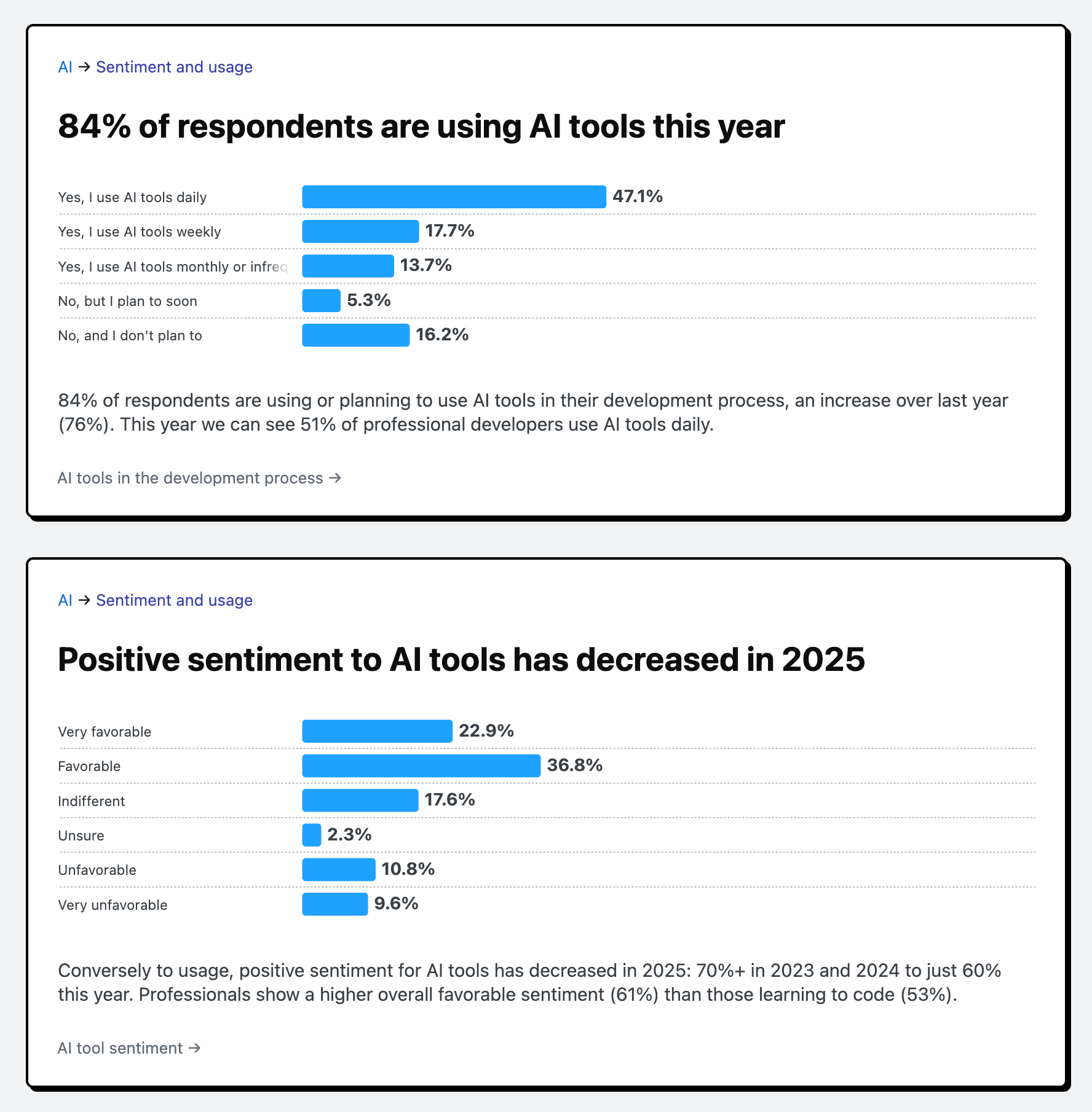本文基于 Stack Overflow 2025 年度开发者调查报告,深入分析了 AI 工具在开发者工作流中的现状与影响。报告揭示,虽然 AI 工具使用率创新高(84%),但满意度却下降(从 70% 降至 60%)。核心问题在于 AI 的“差不多对”困境,导致开发者将更多时间用于调试 AI 生成的代码,而非想象中的生产力飞跃。文章指出,AI Agent 仍处于早期阶段,开发者对其信任度不高。技术风向方面,Python 受益于 AI 红利增长迅猛,PostgreSQL 凭借其多功能性超越 MySQL,而 Rust 生态工具也展现强劲势头。文章进一步探讨了“Vibe Coding”被专业开发者普遍拒绝的现象,以及 AI 在开发者工作流中的信任边界:AI 适用于辅助性任务(如搜索、文档),但关键任务(部署、监控、架构设计)仍需人类主导。最后,作者提出未来编程的价值锚点将向上游移动,架构师角色日益凸显,会使用 AI 且懂架构的程序员将淘汰只会写样板代码的程序员,强调了系统设计能力的重要性。